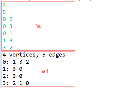 注意:输入部分来构建图 1。输入 4、5 分别表示图由 4 个顶点、5 条边组成。之后输入 "0 2"、"0 3" 等表示图中顶点相连的边,且输入 "0 2" 和 "2 0" 是一样的效果,选择其一输入即可。